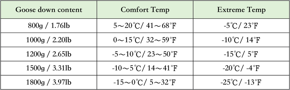Down Content & Comfort Rating: 800g(1.76lb) & 41~68ºF (5~20°C)